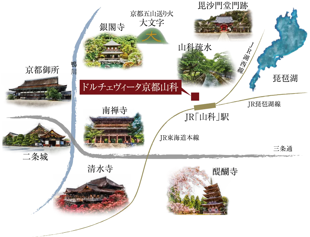 阪神高速8号京都線「山科」ICも近く、複数のルートを選択可能。